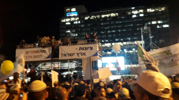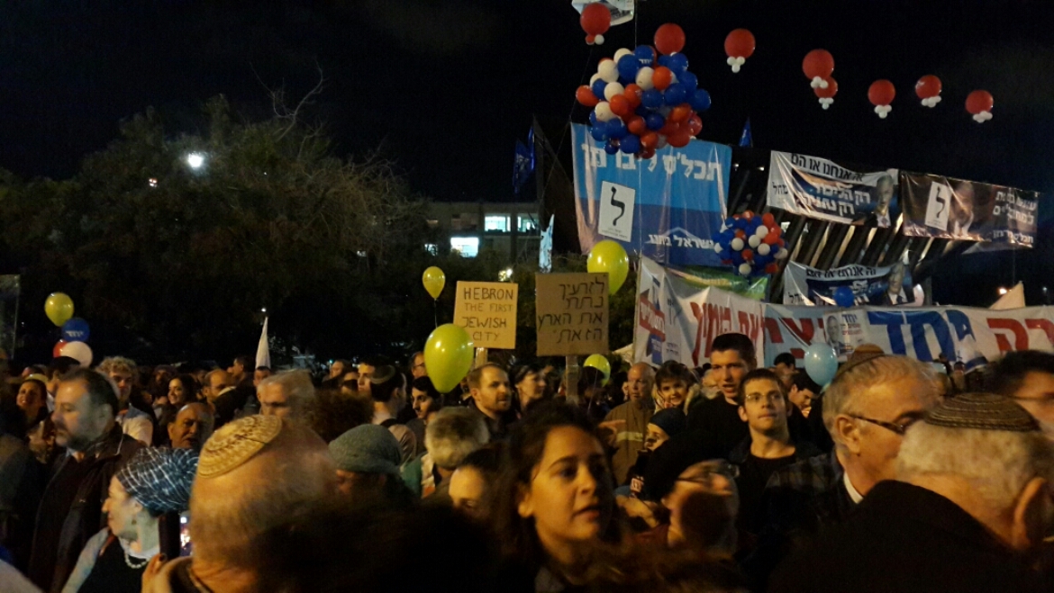 Die Kundgebung der sich als rechts bezeichnenden Parteien an diesem Sonntag (15.03) verlief unter dem Motto „Gemeinsam für das Land Israel“, und über sie hat Richard Schneider nicht ausführlich berichtet. Auch hier wurden mehrere zehntausend Teilnehmer gezählt (zunächst war sogar von 100.000 die Rede), die mit Flaggen, Ballons und Plakaten mit Slogans, T-Shirts und Aufklebern in allen Farben versammelt hatten, um die Hauptsprecher der Demonstration: Premierminister Netanyahu und die Vorsitzenden der Parteien „Habayit Hayehudi“ – Naftali Bennett – und „Yachad“ – Eli Yishai – zu hören. Zur Demonstration kamen Leute aus allen Ecken des Landes, spezielle Busse wurden zur Hinfahrt organisiert, wer mitfahren wollte, tat es kostenlos.