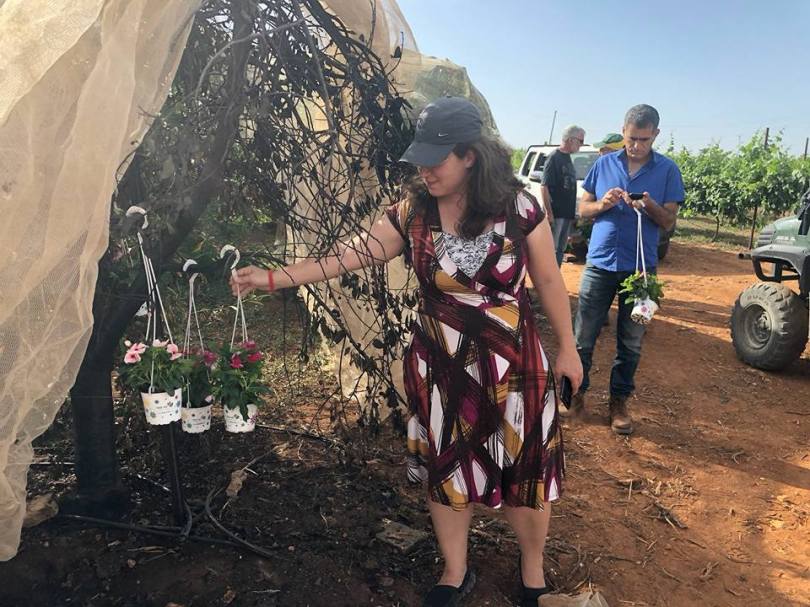 Blumen werden an die verbrannten Äste der Kirschbäume in Kfar Etzion gehängt. Foto; Eliaz Cohen