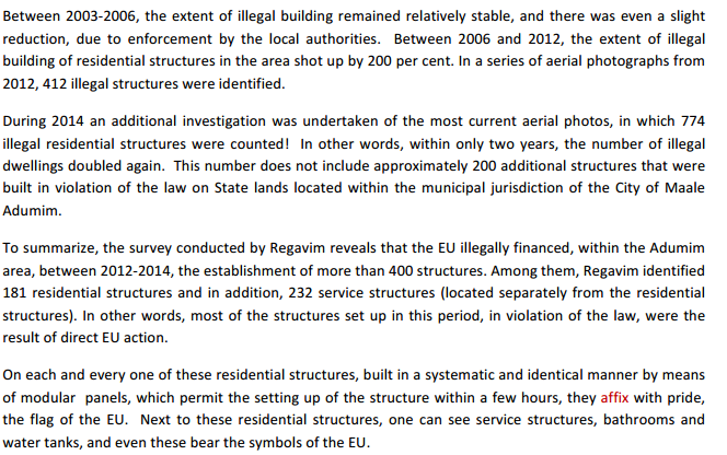 landwirtschaftlichem Gebiet von arabischen Bauern an dieser Stelle an, der konkrete Privatbesitz der Ländereien konnte allerdings noch nicht festgestellt werden. In jedem Fall hatte dieses Gebiet nichts gemein mit der Blechsiedlung, welche seit 1986, unterstützt von linken israelischen Organisationen und ausländischen – darunter europäischen! – Geldern, ausgebaut und nach Abrissen immer wieder neu errichtet wird, und das ohne jegliche Baugenehmigung seitens der israelischen Regierung in dem unter ihrer Verwaltung stehendem Gebiet! (Siehe den Bericht bei Times Of Israel – Spendengelder und Anlagen der EU, darunter Deutschland, in Susya)