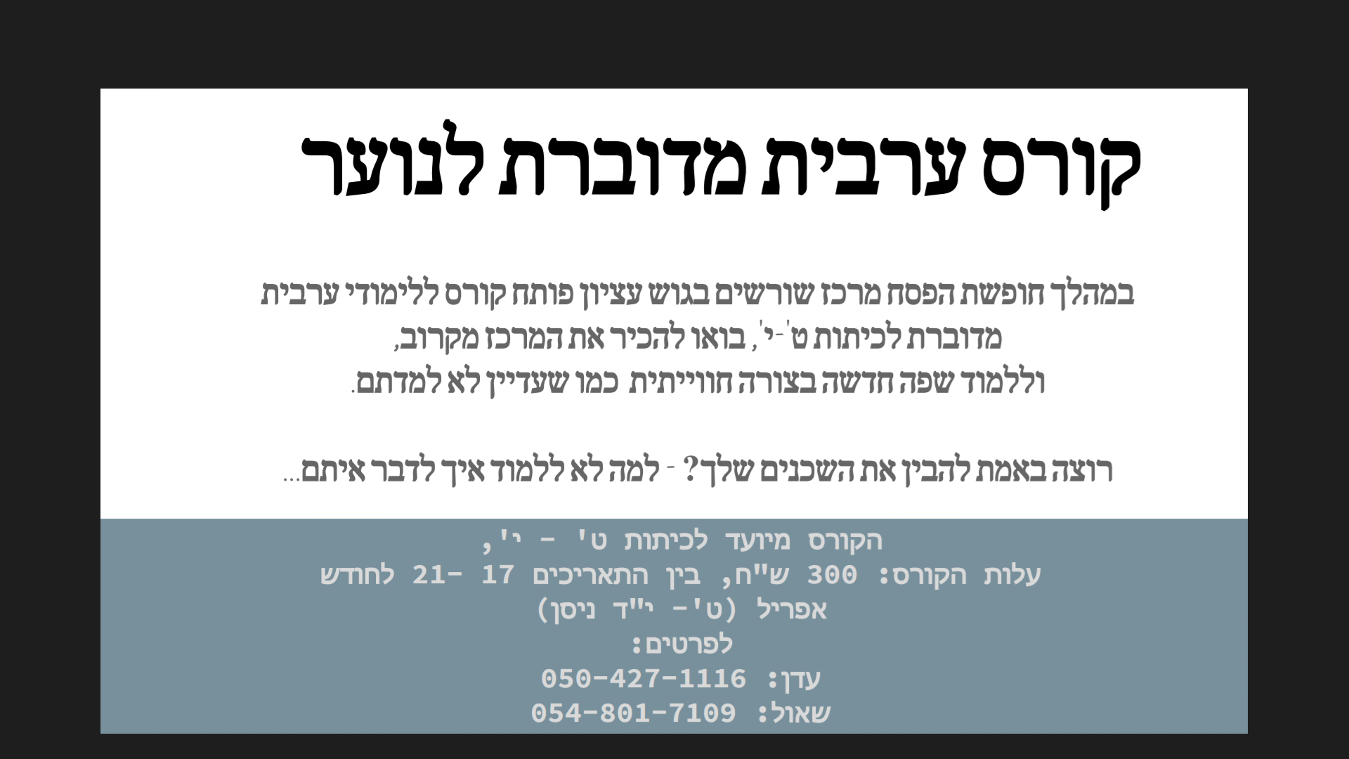 In diesen Pessach-Ferien (bis zum kommenden Samstag, 30.04) hat „Roots“ angekündigt, einen Arabisch-Sprachkurs für Jugendliche der 9.-10.Klassen durchzuführen – nämlich auf der Farm des arabischen Aktivisten Ali Abu Awwad unweit von Alon Shevut, unter dem Motto „Willst du deine Nachbarn verstehen?“. Auch ein Kurs für Erwachsene ist angekündigt.