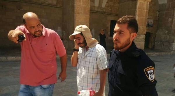Jüdischer Israeli (Mitte) wird von einem Waqf-Hüter (links) und einem israelischen Polizisten vom Tempelberg ausgewiesen, nachdem er dort geweint hat. Quelle: Twoday.co.il