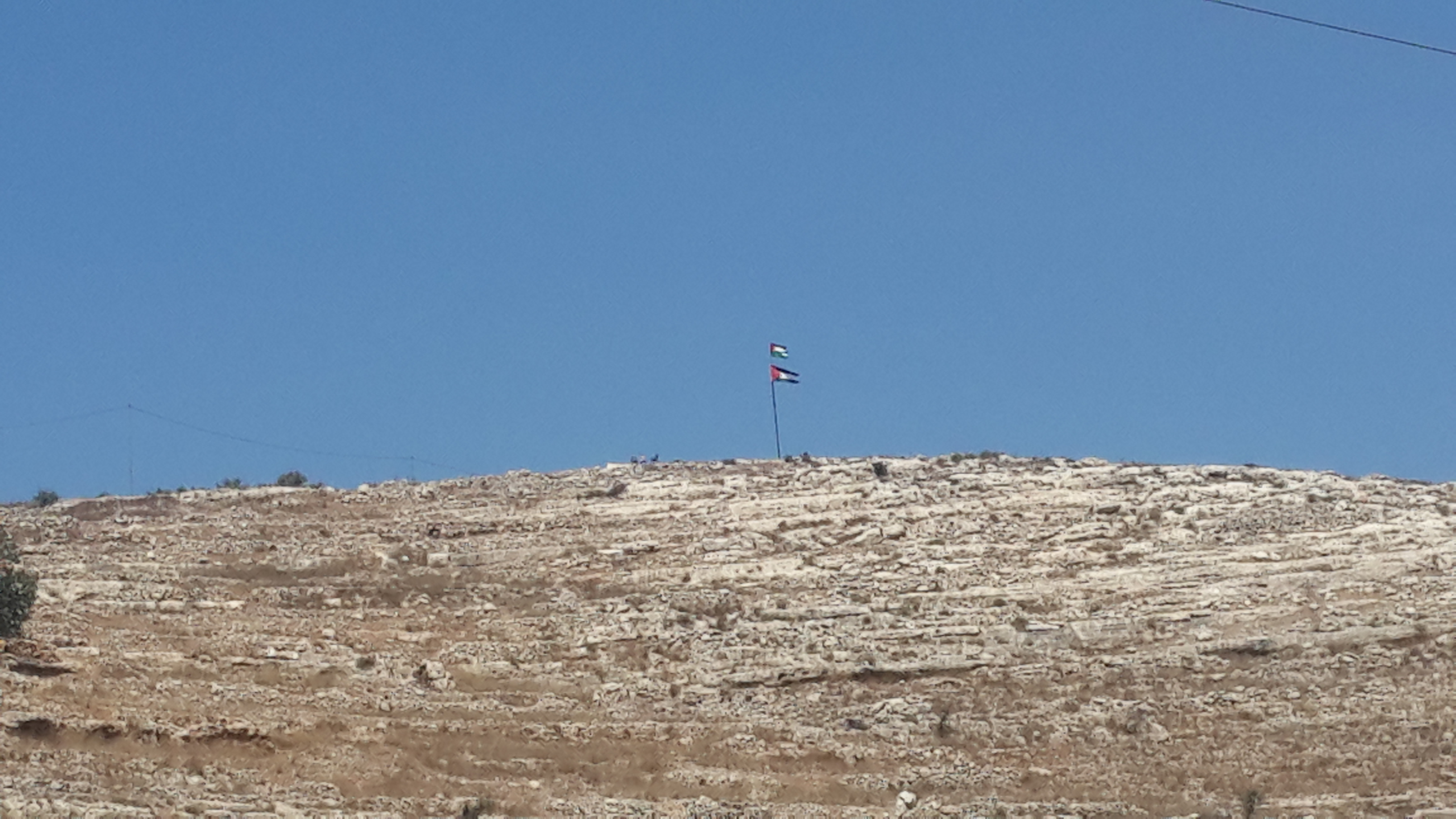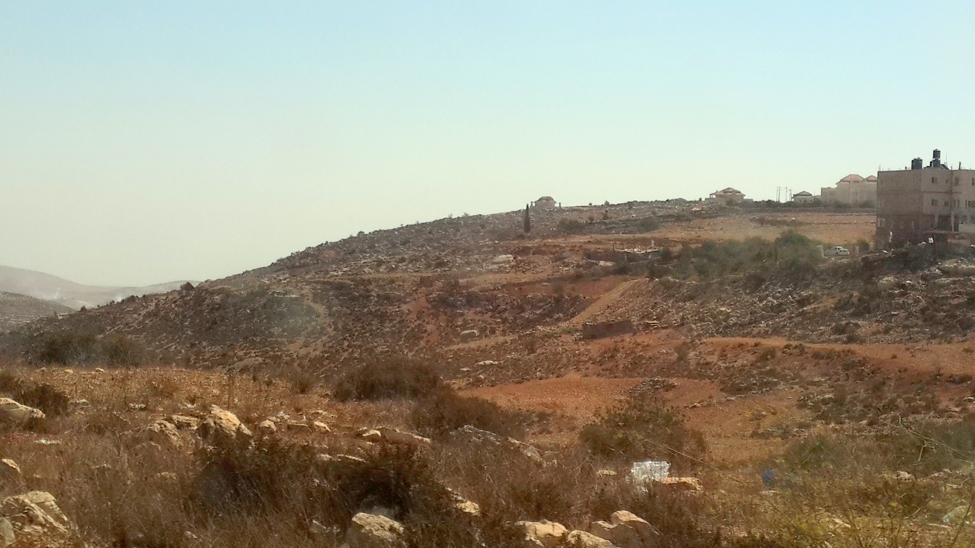 Der Wadi beginnt auf der rechten Seite der Autobahn 465 abwärts, führt an einigen Weinplantagen und einem kleinen arabischen Bauernhof vorbei und weiter in das Tal zwischen den Hügeln. Ich klettere hoch auf die Hügel, um einen besseren Überblick zu behalten. Über mir kann ich einen Ziegenhirten erkennen, den ich auf Arabisch grüße, ebenso ein paar Feldarbeiter unterhalb von meinem Pfad. Der Pfad lässt sich nicht besonders gut erkennen, außerdem bevorzuge ich es, in dieser noch bewohnten Gegend eher weniger Aufmerksamkeit auf mich zu ziehen – immerhin wandere ich allein und kenne die arabischen Bauern hier nicht. Zu meiner Linken sehe ich auf den Hügeln das Dorf Deir Nizzam und hinter mir weht auf einem anderen Hügel eine palästinensische Flagge. Dahinter befindet sich der Ort Nabi Saleh.