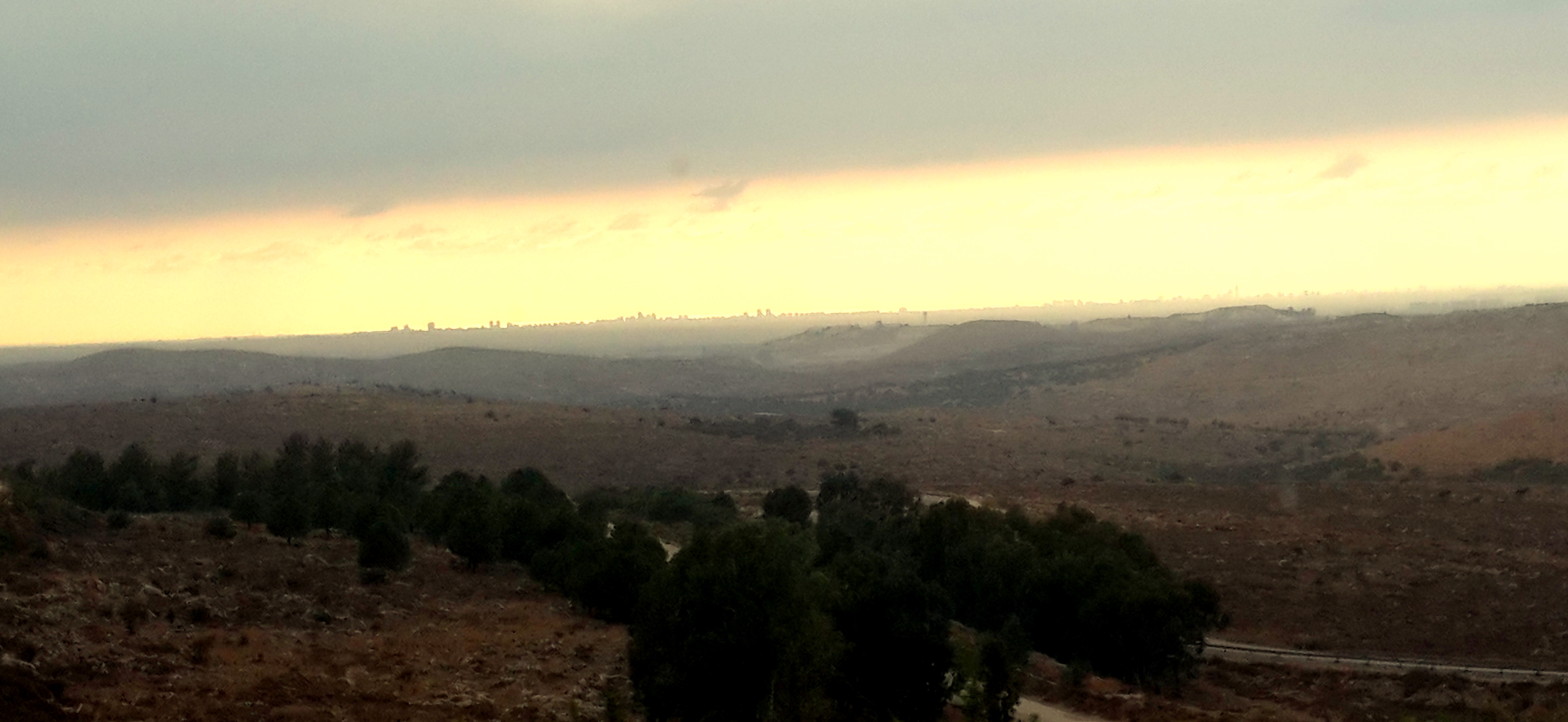 Von Beit Arye aus gibt es eine Aussicht auf die Küste und die Hochhäuser von Tel Aviv. Diese sehe ich trotz Dämmerung am Horizont.