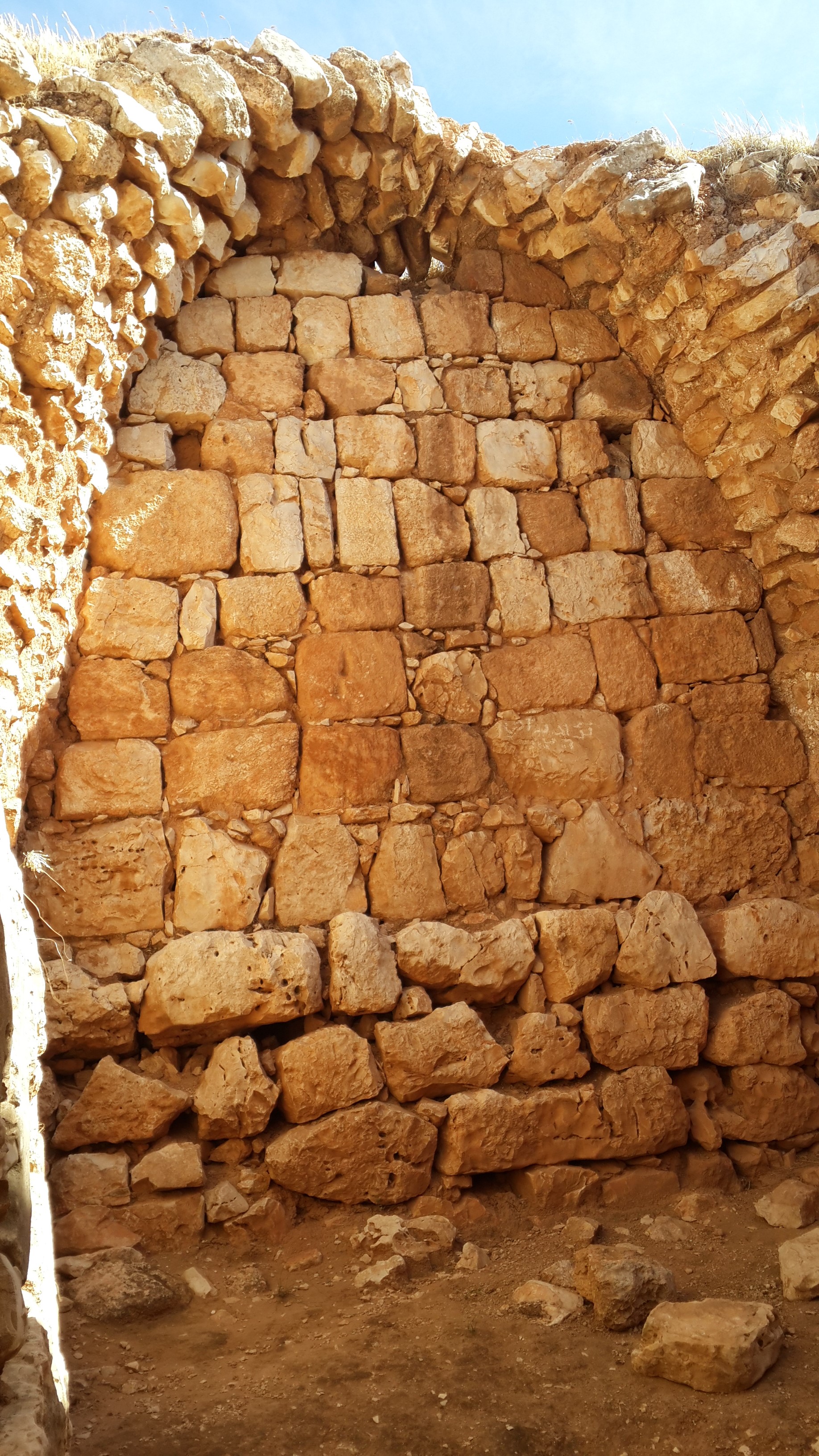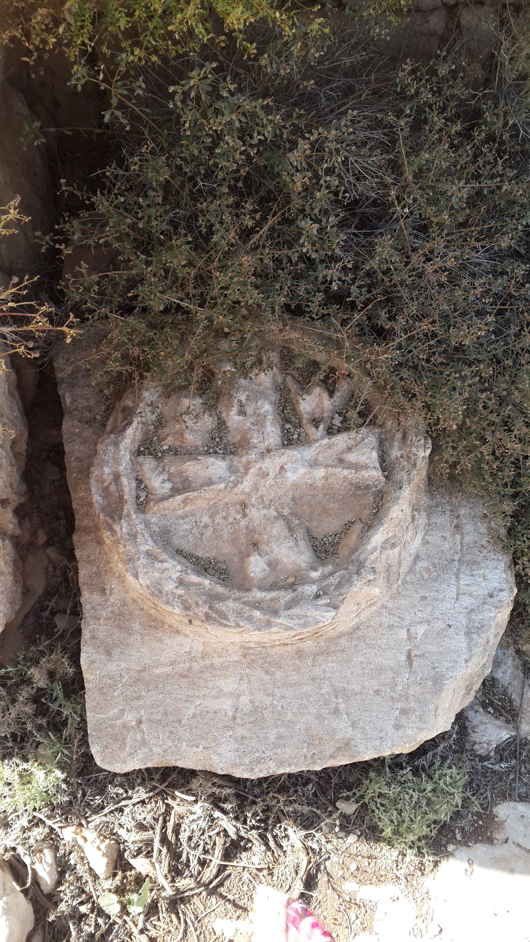 Die Ausgrabungen, so stand auf einem von Korrosion schwer zerfressenen Schild geschrieben, fanden hier zwischen 1982 und 1992 statt. Ausgegraben hatte man einen Kirchenkomplex aus byzanthinischer Zeit, allerdings sollen die ersten Lebensspuren hier noch aus seleukidischer Zeit stammen. Nach den Byzanthinern herrschten im Land die Umayyaden und die Abbassiden, auch unter ihnen erreichten Einwohner diesen Ort. Insgesamt, so besagte das Schild, soll hier 500 Jahre lang aktives Leben gegeben haben, danach wurde der Ort verlassen. Tatsächlich fanden wir in den Ruinen einen Stein mit dem Abbild eines Kreuzes und eine halbrunde Halle. Man erkennt Eingänge und Stauräume, in den Stein gehauene Abflusskanäle und seltsame runde Vertiefungen, die häufig auch mitten in einem Raum zu finden sind. Da ich nicht sonderlich bewandert bin in Archäologie, wusste ich dieses Phänomen leider nicht zu erklären.