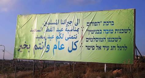 Das „Forum für gute Nachbarschaft“, eine Gruppe von einzelnen jüdischen Einwohnern aus Samaria und Judäa, hat den Vorstehenden der Regionalverwaltung die Initiative vorgelegt, den Segensschilder zum Feiertag auf Arabisch und Hebräisch auf den Schnellstrassen aufzustellen. Vor einem Jahr hatte der Vorschlag kein Interesse gefunden, in diesem Jahr sprach eins der Forumsmitglieder, Jacky Fried, den Regionalvorstehenden von Binyamin (Südsamaria), Avi Roeh, an, und dieser erklärte sich bereit, die Veröffentlichung zu übernehmen – auch nachdem andere Verwaltungsmitglieder dafür abgestimmt hatten. Das Schild wurde in den letzten Tagen auf einer Schnellstrasse im Binyamin-Gebiet aufgestellt. Es hat kein offizielles Verwaltungslogo („Das war offenbar schon zuviel“, so Fried), aber dennoch die angenehme Botschaft: