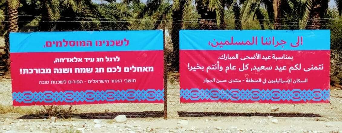 „An unsere muslimischen Nachbarn anlässlich des gesegneten E’id al-Adha-Festes, wünschen wir euch ein frohes Fest und ein gesegnetes Jahr. Die israelischen Einwohner der Region – Forum für gute Nachbarschaft“