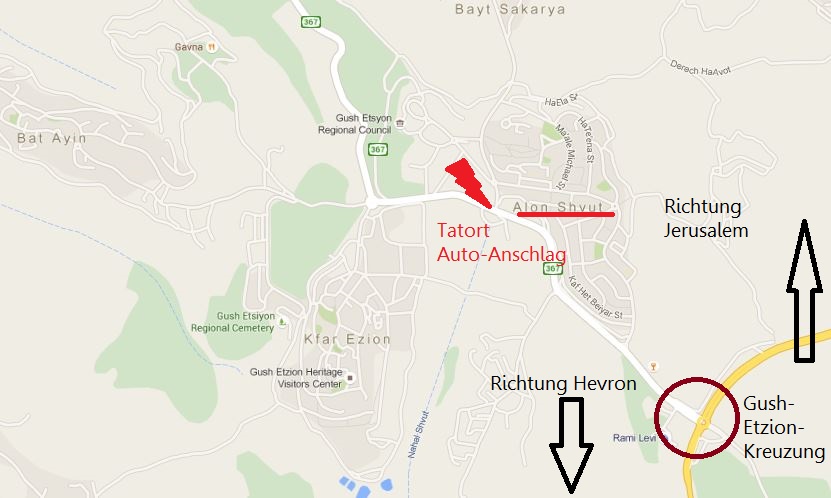 Gestern, am 14.05.15, kurz nach 1 Uhr nachmittags (israelische Zeit) wurde an der Bushaltestelle in der Nähe des Einfahrtstores von Alon Shevut ein Attentat verübt . Ein palästinensischer Autofahrer raste in eine Gruppe wartender Jugendlicher am Straßenrand und fuhr dann im selben Tempo weiter. Kurze Zeit später wurde er von der Armee angehalten, die sofort nach der Nachricht Straßensperren errichtet hatte, und verhaftet. Der Terrorist gestand die Tat. Vier (entgegen den ersten Berichten über drei) der jungen Leute wurden verletzt, einer davon schwer (Arye) und der andere mittelschwer (Ido).