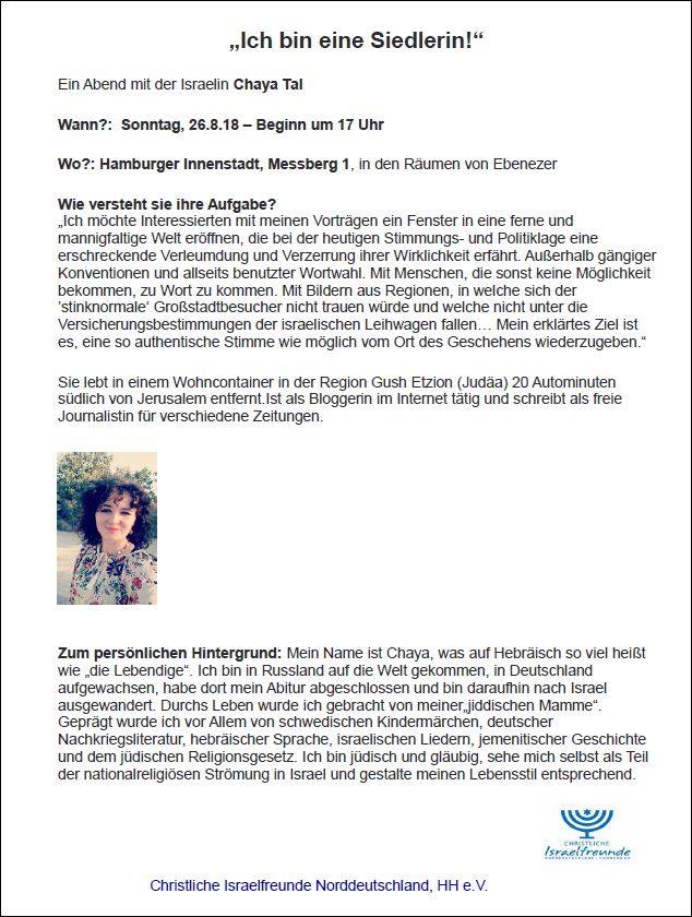 Zwischen dem 12.August und dem 04. September 2018 habe ich eine Vortragsreise zum Thema „Jüdisches Leben in Judäa und Samaria“ in Deutschland und der Schweiz organisiert. Dabei wurde ich von verschiedenen Veranstaltern – Vereinen und Kirchengemeinden – eingeladen und hielt Vorträge und Gesprächsrunden über meine persönlichen Erfahrungen innerhalb der jüdischen Gemeinden in Judäa und Samaria (Westjordanland), die Geschichte der Region und der Siedlerbewegung und die aktuelle gesellschaftliche und politische Situation. Ebenso berichtete ich über die lokalen Friedensbemühungen zwischen jüdischen Siedlern und Palästinensern und stellte wahlweise politische Alternativen zur Zwei-Staaten-Lösung vor. Zum Vortrag gehörte eine visuelle Präsentation.